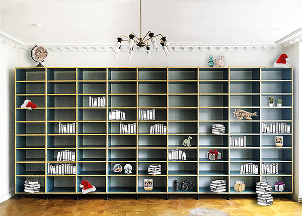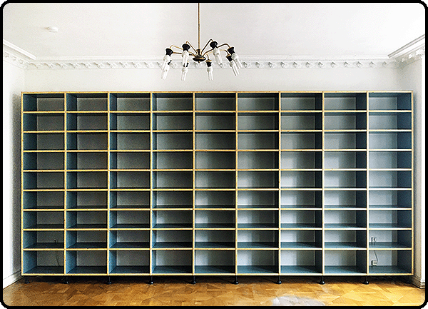 Mehr Fächer als Türchen im Advenbtkalender ... und täglich Platz für Ideen, Impulse, Bewahrenswertes. Dieses Regal wirkt durch sein bachtliches Volumen und hebt sich dabei respektvoll vom bewegten Altbau-Raum ab. Die farbig lackierten Flächen bringen Ruhe in die Textur des Holzes. Die natürlich belassenen Kanten strahlen umso mehr und betonen die lineare Sachlichkeit.