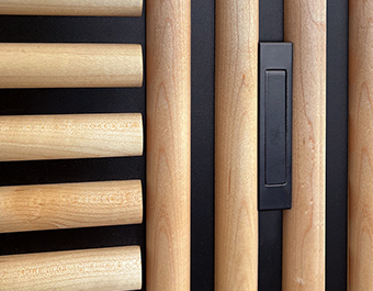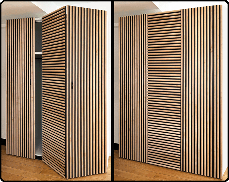 | Leistenwunder für den guten Ton Üppiges Volumen und optimale Zugänglichkeit waren für den Schrank im Musikzimmer gefragt. Auch sollte das Design der Fronten Aspekte der Raumakustik berücksichtigen. Gefräste Halbrundprofile in Ahorn geben dem Schrank nicht nur eine ebenso elegante wie naturnahe Anmutung, sie sorgen vor allem für den guten Raum-Ton. Zwei der drei Türen sind als Faltung gekoppelt. In die Struktur der Türfronten dezent eingelassen sind die metallenen Griffe - nach innen gedreht verschwinden sie optisch fast völlig.