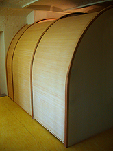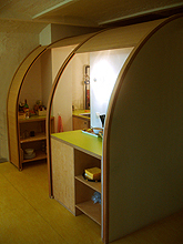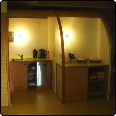 Das Büro-Loft wird vielfach genutzt. Neben Kreativ-Arbeitsplätzen und Konferenzraum wurde ein Raum im Raum installiert zum Dinnieren zwischendurch. Nach dem Mahl verschwindet alles ganz rasch hinter Rollläden notfalls sogar der Abwasch...