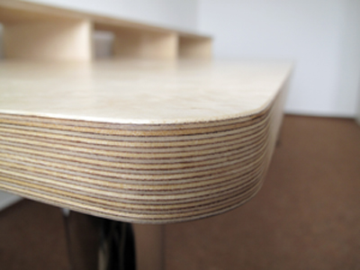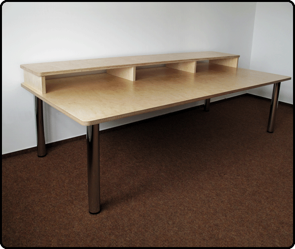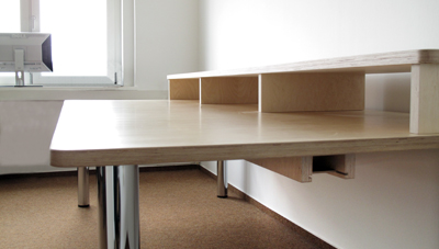 Arbeitsplatz für drei Computer in ergonomisch bestimmter Höhe mit reichlich Platz für Tastatur und Vorlagen sowie mit Kabelführung unter der Tischplatte, die aus formstabilem schichtverleimten Material gefertigt wurde.