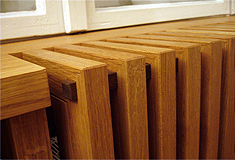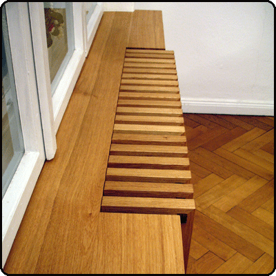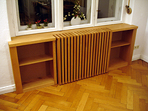 Ein Kleid für den Heizungskörper Warme Luft entströmt dem mittleren Regalteil unterm Fenster. Holzrippen verdecken den Heizkörper, ohne seine Funktion zu stören. Man vermutet gar nicht, dass etwas versteckt werden soll, so organisch fügt sich der halbhohe Dreiteiler in die Fensternische. Für Regelungen an der Heizung lässt sich der Rippenteil mühelos abnehmen. ![]() ![]() ![]() ![]() ![]() |