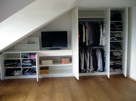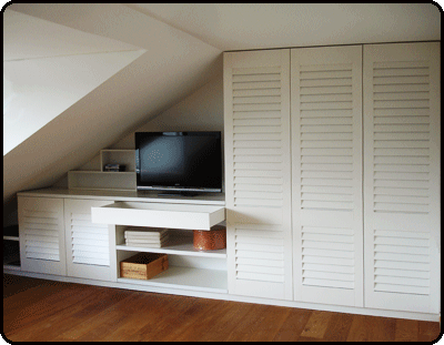 | Lamellentüren machen es wohnlich Diese Lamellen sind besonders breit, die Rahmen dagegen schmal. Durch diese Strukturierung der Fronten erscheint der Schrank nicht klotzig: die beträchtliche Gesamtbreite und die 2,60 m Höhe sieht man ihm nicht an! Solidität wie Leichtigkeit strahlt er aus. In Wand und Dachschräge ist er völlig integriert optisch unterstützt durch einheitliches Weiß. Kleidung, einige Bücher und der Fernseher finden Platz, ein bisher kaum genutzter Raum wurde wohnlich. ![]() ![]() |