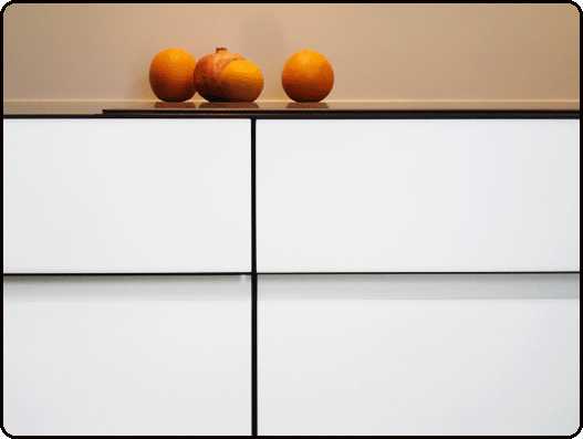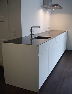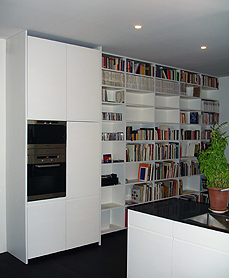 Wohnküche mit Stil Der große Raum soll beides ermöglichen Kochen und Wohnen, funktional wie gemütlich sein. An den Küchen-Hochschrank schließt sich das eingepasste Bücherregal an. Alles ist in Mattweiß hartlackiert. Die Arbeitsstrecke besticht durch die Kantenausführung „auf Gehrung”. Auszüge und Türfronten werden mittels eingefräster Griffleisten geöffnet. ![]() ![]() ![]() |